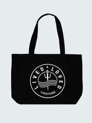 Shoppertasche aus Bio-Baumwolle in Black mit Lived & Loved Repairs-Logo